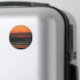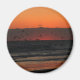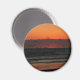 A photograph of birds flying over the ocean into a fire orange sky during a sunrise on the beach on a magnet