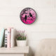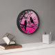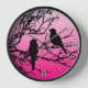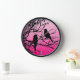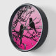 Clock depicting two little birds, perched on a branch, as a black silhouette against a dawn sky gradient of deep fuchsia pink to pastel ice pink