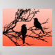 Print depicting two little birds, perched on a branch, as a black silhouette against a sunset sky gradient of deep to pastel coral orange
