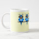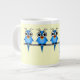 Colourful, funny and cute blue birds on a wire tweeting with one bird upside down. Humourous bird lover coffee mugs. Unique and fun bird apparel and gifts for bird watchers, ornithologists and bird lovers.