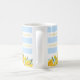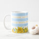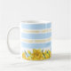 The Flower-of-the-Month and Birthstone for March on a striped mug. The flower and gem pair for March is the Daffodil and the Aquamarine.