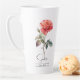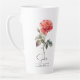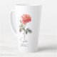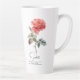 Birth month flower June Rose latte mug with an illustration of a rose flower. Below the flower, the name is written in an elegant script font. Beneath the name, it states "June - Rose," indicating that the owner's birth month is June and her birth flower is the rose. It is a personalized mug, created as a thoughtful gift for someone born in June.