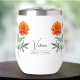Birth month flower October Marigold wine tumbler featuring an illustration of a marigold flower. Below the flower, the name is written in an elegant script font. Beneath the name, it states " October - Marigold" indicating that the owner's birth month is September and her birth flower is the gladiolus. It is a personalized wine tumbler, customized as a thoughtful gift for someone born in October.