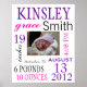 A great poster to hang up in the nursery. Send me an email with the contact the seller button, with the information and colors you want and I'll make it for you to purchase. Please do not purchase until I've sent you the link with your babies information. It will be a direct view not public. Upload your baby's birth photo.
