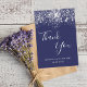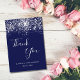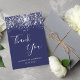 A thank you card for a 50th (or any age) birthday. A navy blue background colour, decorated with faux silver glitter dust. On front hand lettered script and the text: Thank You, your text, title and a date.