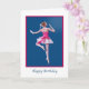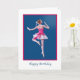 The lovely little ballerina strikes a pose in her pink and white costume on background of blue. She is wearing white gloves and has a white ribbon in her hair. Her back is turned to the audience. It makes a great ballet themed image on this colourful birthday greeting card.
