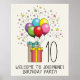 Destei's fun original birthday theme design featuring colorful birthday balloons and two present boxes wrapped with pretty bows. The design is framed by cheerful confetti made out of stars and dots. The color scheme includes colors such as red, pink, blue, yellow, purple, teal, and beige. There are also two personalizable text areas where one is meant for the person's age and another is meant for custom text.