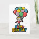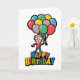 funny character holding balloons Happy Birthday card.