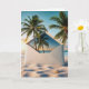 A surreal scene depicts an open envelope standing on a tropical beach, with palm trees and a beautiful sunset in the background.