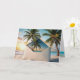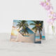 A surreal scene depicts an open envelope standing on a tropical beach, with palm trees and a beautiful sunset in the background.