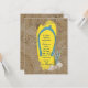 Bright yellow flip-flop in the sand with seashells for beach party.