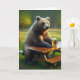 Big bear sitting at a picnic table with a mug of beer for birthday.