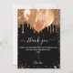 A black background colour. With dark faux gold glitter, sparkles and balloons. On front large hand lettered script and the text: Thank You.
