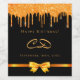 Faux gold coloured ribbon and bow with faux gold glitter drips, paint dripping look. A chic black background. Personalize and add your monogram, initials and a date. With the text. Happy Birthday. Golden coloured letters.