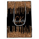 A gift bag for a girly and glamourous 21st (or any age) birthday. A black background with faux gold glitter drips, paint dripping look. Personalize and add a name and monogram letters. The name is written with a trendy hand lettered style script.