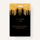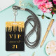 A modern, stylish and glamorous badge for a 21st (or any age) birthday party. A black background with faux gold glitter drip, paint dripping look. The name is written with a modern hand lettered style script with swashes. With the text: VIP Number 21 is written in a golden color. To keep the swashes only delete the sample name, leave the spaces or emoji's in front and after the name.