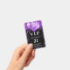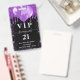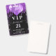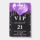 A modern, stylish and glamourous badge for a 21st (or any age) birthday party. A black background with purple faux glitter drips, paint dripping look and balloons. With the text: VIP. Personalize and add name, age, address/date. The name is written with a modern dark rose gold coloured hand lettered style script with swashes.