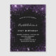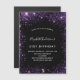 A girly and feminine 21st (or any age) birthday party invitation. On front: A chic black background. Decorated with dark purple faux glitter dust. Personalize and add a name and party details. The name is written with a hand lettered style script, light purple coloured letters.