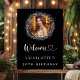 A welcome poster for a glamourous 30th (or any age) birthday party. A classic black background decorated with a faux silver glitter photo frame. Personalize and add a photo and name. Welcome with a heart.