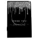 A favour bag for a girly and glamourous birthday party. Black background decorated with faux silver glitter drips, paint dripping look. With the text: Thank You! Personalize and add your name. The name is written with a trendy hand lettered style script with swashes.