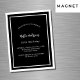 A modern, elegant magnetic invitation. A black background decorated with white frames. Personalize and add a name and details. White text.