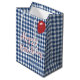 Blue and white gingham check pattern with Happy Birthday text and red balloon