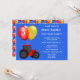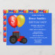 This birthday party invitation features colourful balloons and a red tractor Personalize this invitation with your child's age and party information. The background of this invitation is in blue, if you prefer another colour there are many to choose from.