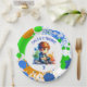Personalized name and age birthday party plates. Cute little anime boy playing video games with a blue, orange and green paint splatter background done in an ai watercolor style illustration.