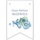 Make a splash at your little one's birthday party with these birthday bunting flags, featuring a cute nautical theme with a watercolor octopus and starfish in ocean-inspired shades of blue. Perfect for a boy’s theme, this under the sea banner is personalized with your child's name and photo milestones, creating a memorable party decoration. The words "Happy Birthday" are displayed in bold navy blue, making this a charming addition to your birthday party signs.