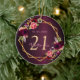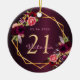 An ornament for a girly and glamourous 21st (or any age) birthday. A dark gradient burgundy coloured background. A faux gold geometric frame and watercolored flowers, florals in burgundy, pink and rose gold. Personalize and add a date, name and age 21. The text: The name is written in pink with a modern hand lettered style script. Perfect as party decoration, favour, keepsake or as a gift.