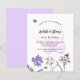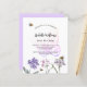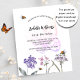 A white background on the front. Decorated with bees and painted wildflowers in violet and pink and a large butterfly. Personalize and add a name and party details.