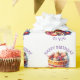 Cute personalized gift wrap with whimsical watercolor style ai illustration of a vanilla cake full of flowers, blueberries, strawberries and whipped cream.