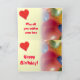 Coloured balloons and red hearts on yellow announce "Let's Party!" Inside the card lovely wishes for Birthday. You can personalize text and colour as well you prefer