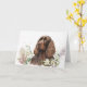 Watercolor design of a cute chocolate cocker spaniel dog in a spring flower garden for anyone's birthday.