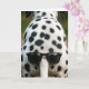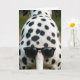 A Dalmatian dog is seen from the back, humorously wearing sunglasses on its tail against a blurred natural background.