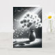 White fluffy dandelion bouquet in a vase with floating seedlings and sunbeams on a black background.