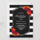 Black and white striped birthday dinner party invitation featuring elegant red and orange floral displays. Text is fully customizable to enable you to include all of your own information for your birthday celebration.