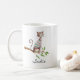 Brighten your mornings with this playful cat lover’s mug. Design features a vibrant watercolor image of a cute cat wearing a green and pink striped sweater sitting on a tree branch with a custom option to add your name on a modern script front. Perfect for sipping coffee, tea, or hot cocoa, this mug brings happiness to your daily routine. Great present for cat lovers, cat moms, cat dads, and kids.