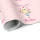 Pink gift wrapping paper. A repeat pattern of a cartoon girl with blonde hair, rosey cheeks and a sweet smile. She is wearing a blue dress with a pink lace trim and blue shoes. She is holding a little bunch of flowers in her hand and is surrounded by butterflies and red love hearts. Above her is the purple text "Birthday Girl" and below is a template to use to add the name of your choice by replacing the example name.