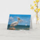 Wish a godfather a happy birthday with this colourful seascape. This gorgeous American White Pelican is known for his vivid blue eyes and pink eye rings. He develops a knob on his beak during breeding season. He is seen standing on a rock at the edge of the water, and a seagull is flying overhead. The blue sky filled with puffy clouds and the waves of the blue green ocean is his backdrop. The inside verse is a text template and easily changed or deleted.