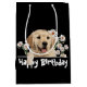 Cute golden retriever with white daisy bouquet on black for birthday.