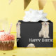 Happy Birthday golden retriever wearing black-rimmed glasses on black background.
