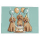 Cute cartoon illustration of Goldendoodle dogs wearing a birthday hat surrounding a birthday cake and balloons. Perfect for pet lovers or dog parents.