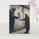 An elderly woman extends her hand toward a graffiti mural of a man offering a vivid red rose on a weathered wall