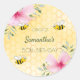 For a 50th (or any age) birthday summer party. Yellow, white background with a honeycomb pattern. Decorated with pink colored tropical florals flowers, hibiscus and happy bumble bees. Templates for a date and name and age 50. Green colored letters. Perfect for a garden, backyard tea party.