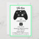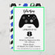 Gaming themed Birthday Invitation for Boys. Lime green, blue and grey colours. Controller, headphone, level up graphics.