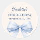 A soft ivory background color. Decorated with a large light blue colored bow. Personalize and add the name and date.