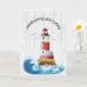 Red and white striped lighthouse with blue wave, Happy Birthday text, and seagulls on a whitewashed wood background.