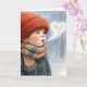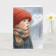 A young boy in a red knitted hat and colorful scarf blows a heart-shaped cloud of breath in a snowy landscape, painted in watercolor.