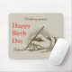 Birthday mousepad inspired by a vintage picture of male hand holding a fountain pen.The hand has just finished adding the name of the person that is having his or her birthday.